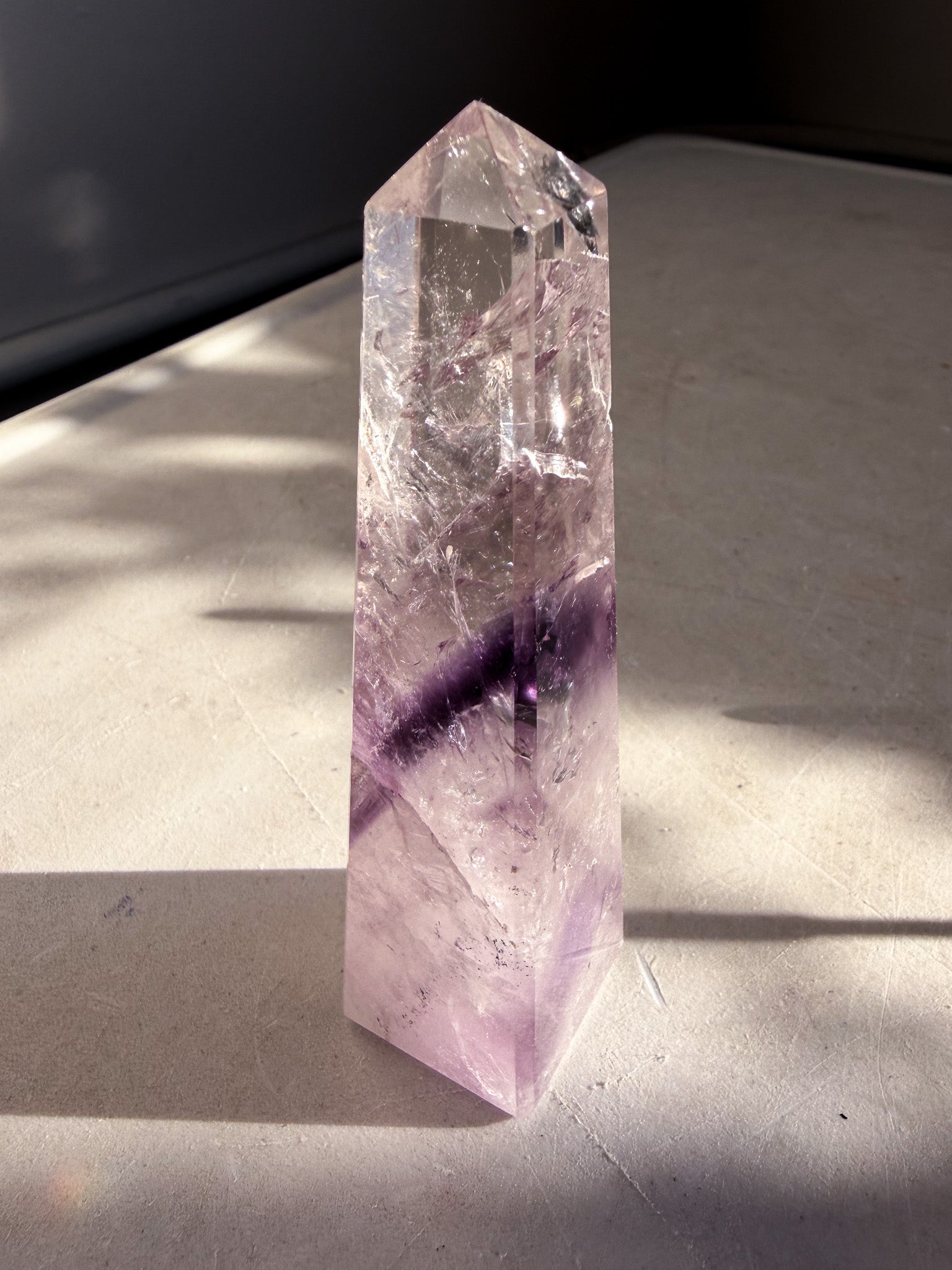 Striking phantom amethyst tower showcasing exceptional clarity and vibrant rainbow inclusions.